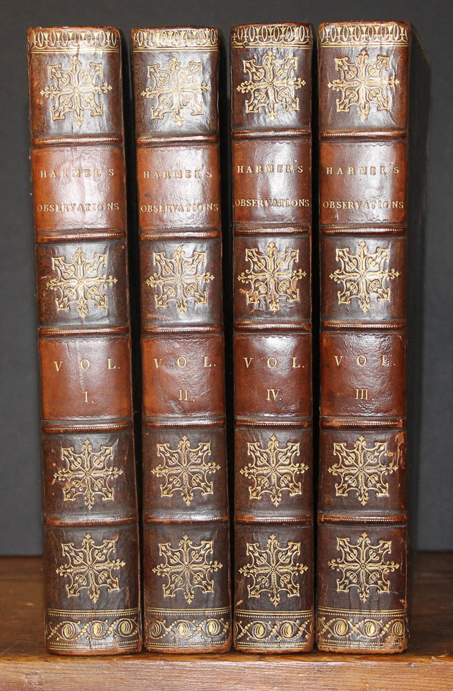 for T. Cadell and W.Davies, London, 1798. Engraved plates. 4 Volumes 8vo (8 1/2 x 5 1/2 inches). Contemporary full tan calf, spines gilt in compartments with crimson lettering pieces; lacks two numbering pieces. Hinges cracked, boards of Volume 2 detached, chip out of upper cover of olume 1, large chip out of one compartment of Volume 2. Overall internally very good.