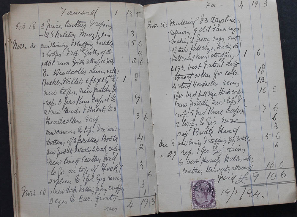 With on front pastedown Moir's engraved label filled in by hand "Mansion Stable Book, Charing. The Right Hon. Lord Hothfield (Stud) To David Moir, Saddler and Harness Maker. Repairs Done Strong and Neat, Oast Hairs made to Order".