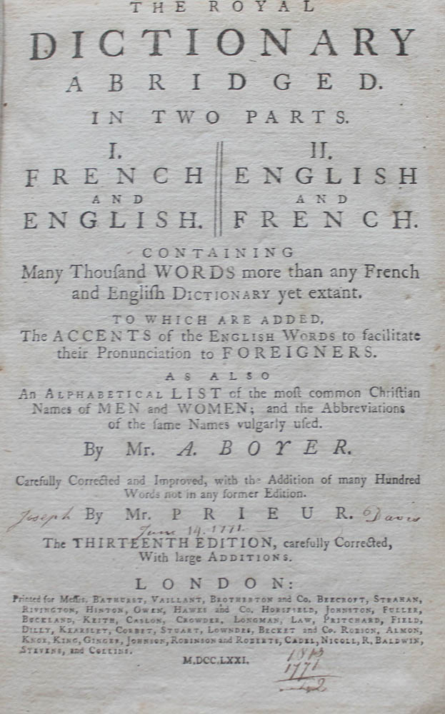 London: for Bathurst, Vaillant (& many others), 1771. Thick 8vo (8 1/2 x 5 1/2 inches), unpaginated. Contemporary full tan calf, rubbed and chipped, both joints cracked and boards held on cords. Old inscription on front free endpaper and signature and date on title. Very minor marginal worming at end.
