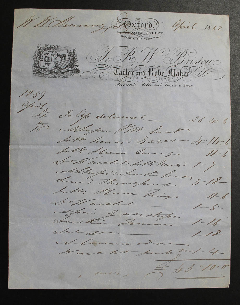 The account bears two dates, April 1842 and April 1859 so it would appear that Mr. Hennesy was rather a slow payer. Numerous items are listed on the 2-sides 4to; with conjugate blank.