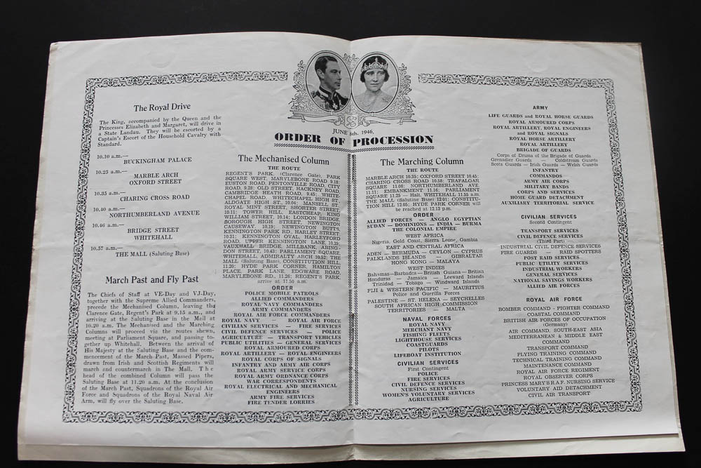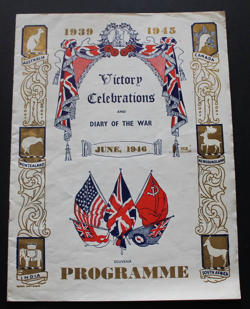 London: Victor Printing Co. 1946. Portraits of Churchill, Eisenhower,Montgomery, & Stalin. 4to (10 x 7 1/2 inches), a pamphlet of 6-pages, wire stitched in the pictorial wrappers printed in gold, red, & blue. A little staining to lower cover else very good. The central spread with portraits of George VI & Queen Elizabeth and details of the processions etc. on June 8th 1946.