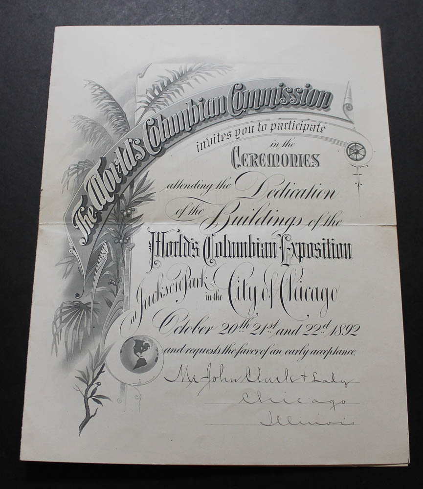 October 20th, 21st, and 22nd, 1892. Engraved invitation filled-in by hand, with conjugate leaf listing the committee members. 11 x 8 1/2 inches with central horizontal fold; very short split on fold else fine.