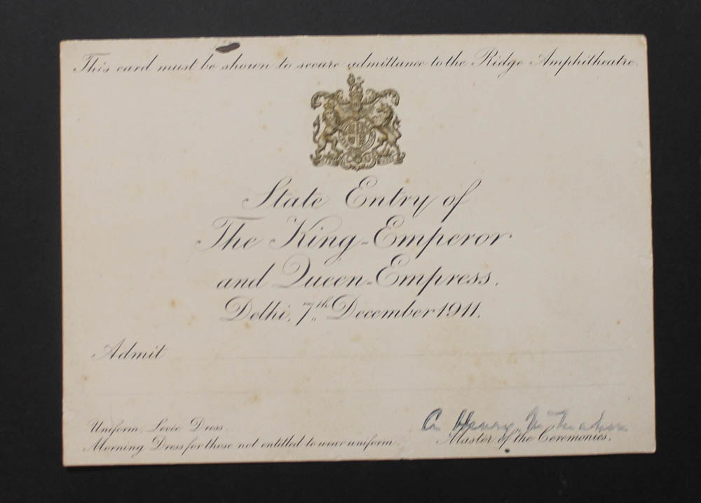 Printed card, 7 x 5 inches, embossed Royal Arms in gilt at head. Some marking and browning. Unused.