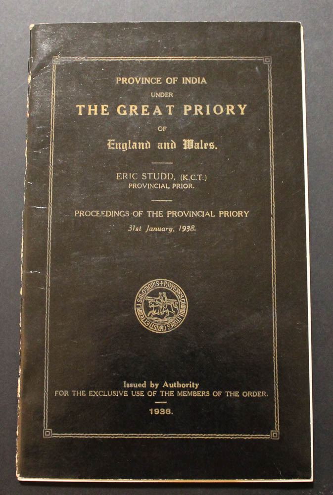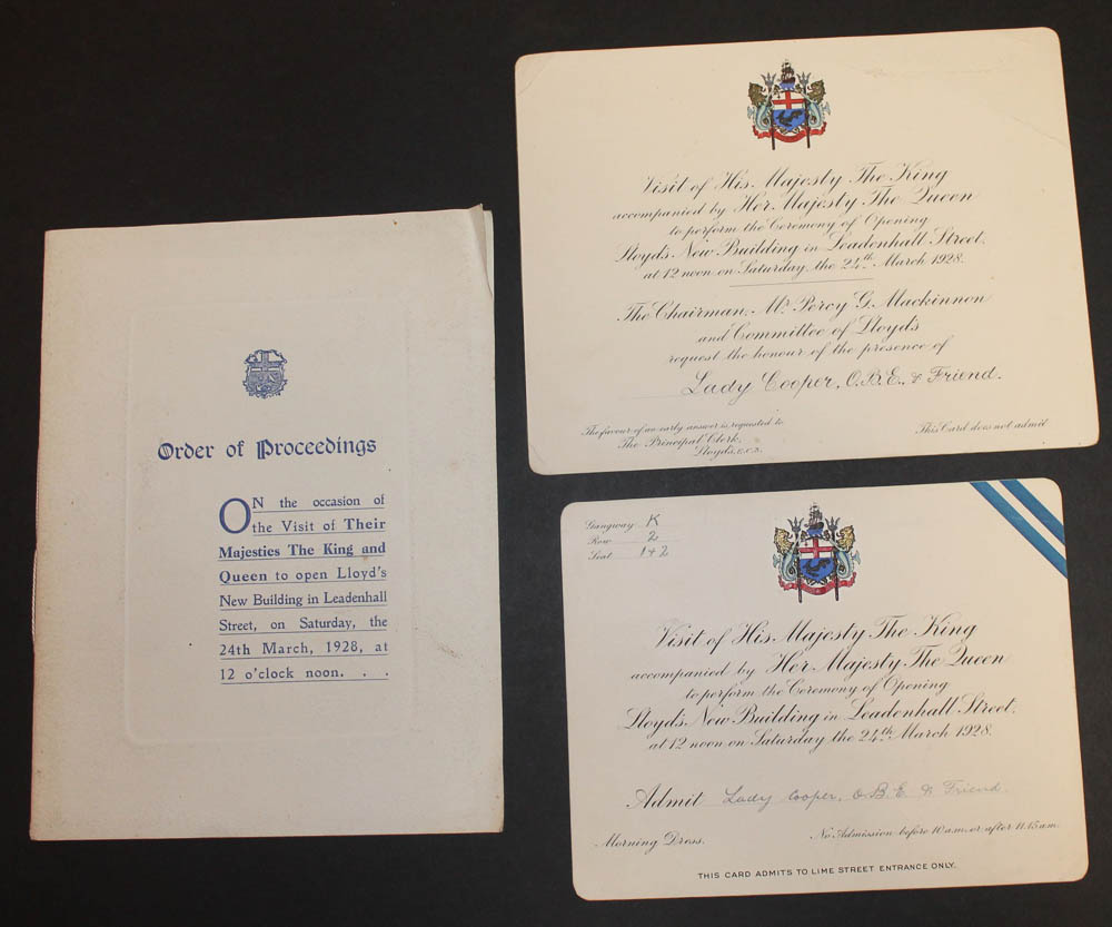 London: 1928. 10-pages printed in blue, original stiff printed wrappers; one corner bent, a little marked. Together with invitation and admission cards, each with embossed arms in gold and colours, made out to Lady Cooper; corner crease and some light surface damage to blank portion of invitation.