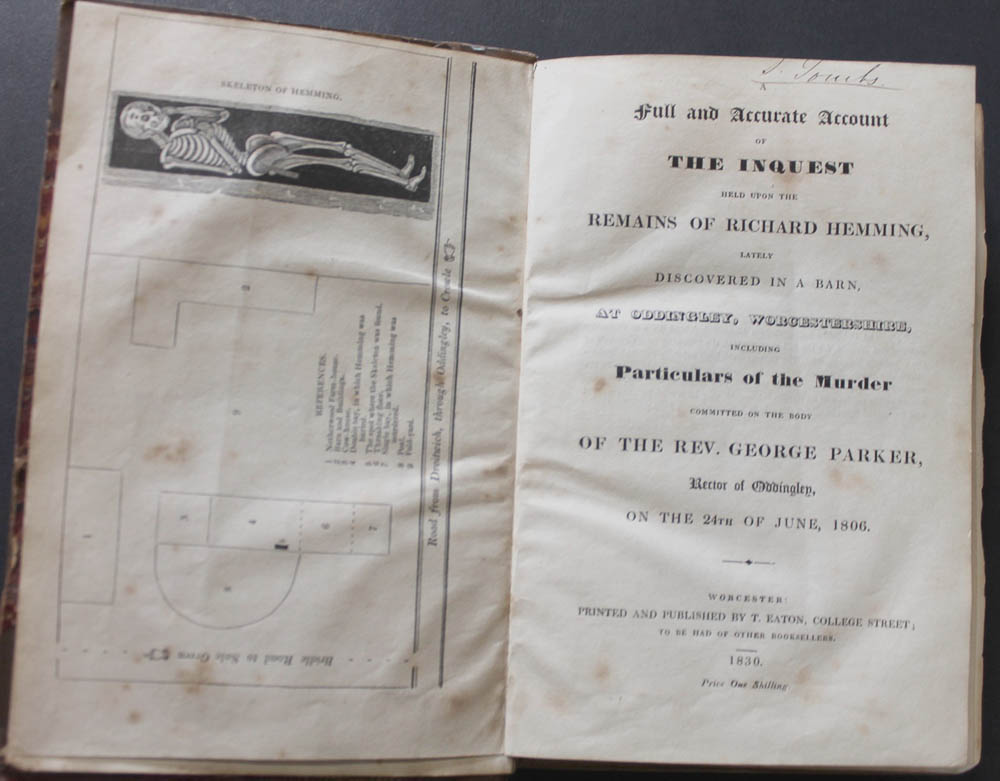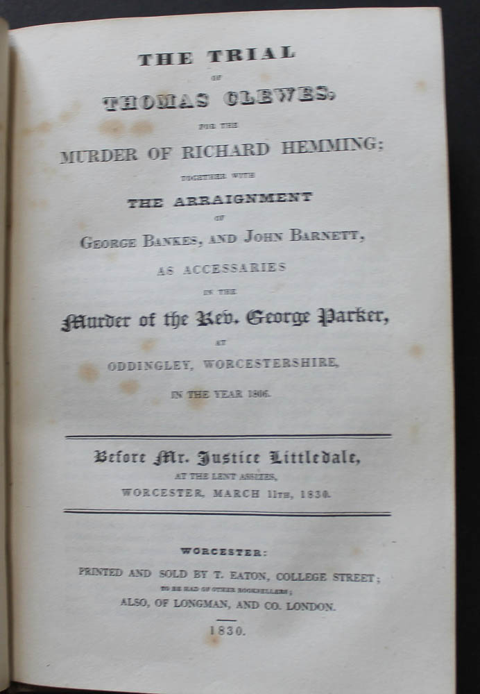 BOUND WITH: The trial of Thomas Clewes, for the murder of Richard Hemming : together with the arraignment of George Bankes, and John Barnett, as accessaries in the murder of the Rev. George Parker, at Oddingley, Worcestershire, in the year 1806 : before Mr. Justice Littledale, at the Lent assizes, Worcester, March 11th, 1830. Worcester: T.Eaton, 1830. 39-pages.