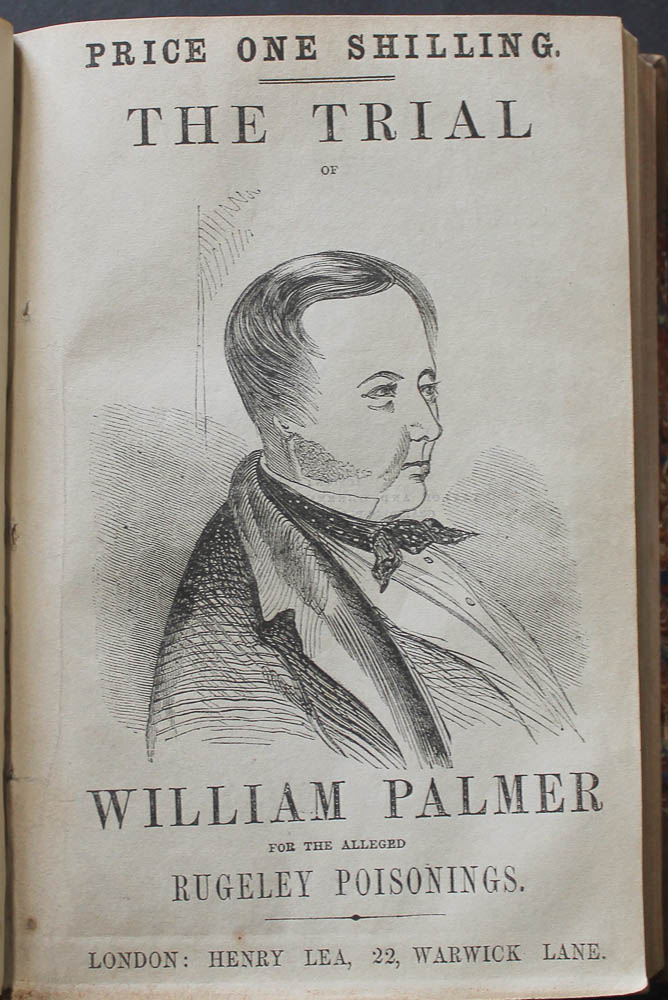 BOUND WITH: The Trial of William Palmer, and for the alleged Rugeley Poisonings. London: Henry Lea [1856]. Woodcut portrait of Palmer on title. 189-pages. Cropped close by binder with the occasional loss (or partial loss) of the last line of text.