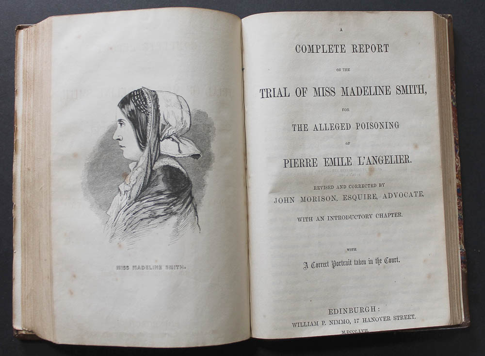 BOUND WITH: A Complete Report of the Trial of Miss Madeline Smith, for the alleged poisoning of Pierre Emile L'Anglier. Revised by John Morison ... with a Correct Portrait taken in the Court. Edinburgh: William P. Nimmo, 1857. Woodcut portrait frontispiece. 184-pages. Cropped close by binder with the occasional loss (or partial loss) of the last line of text. The first two works relating to the murder of Hemming are rare; only 2 copies of the 1st work and only 1 copy of the 2nd work cited by Copac. 8vo (7 1/2 x 5 inches), 19th Century half tan calf, marbled boards, spine diced in blind with black lettering piece; extremities rubbed else good. Inner gutter cracked within first work with two leaves working loose, firm however. Relevant newscuttings on free endpaper. Armorial bookplate on pastedown. Endpapers foxed.