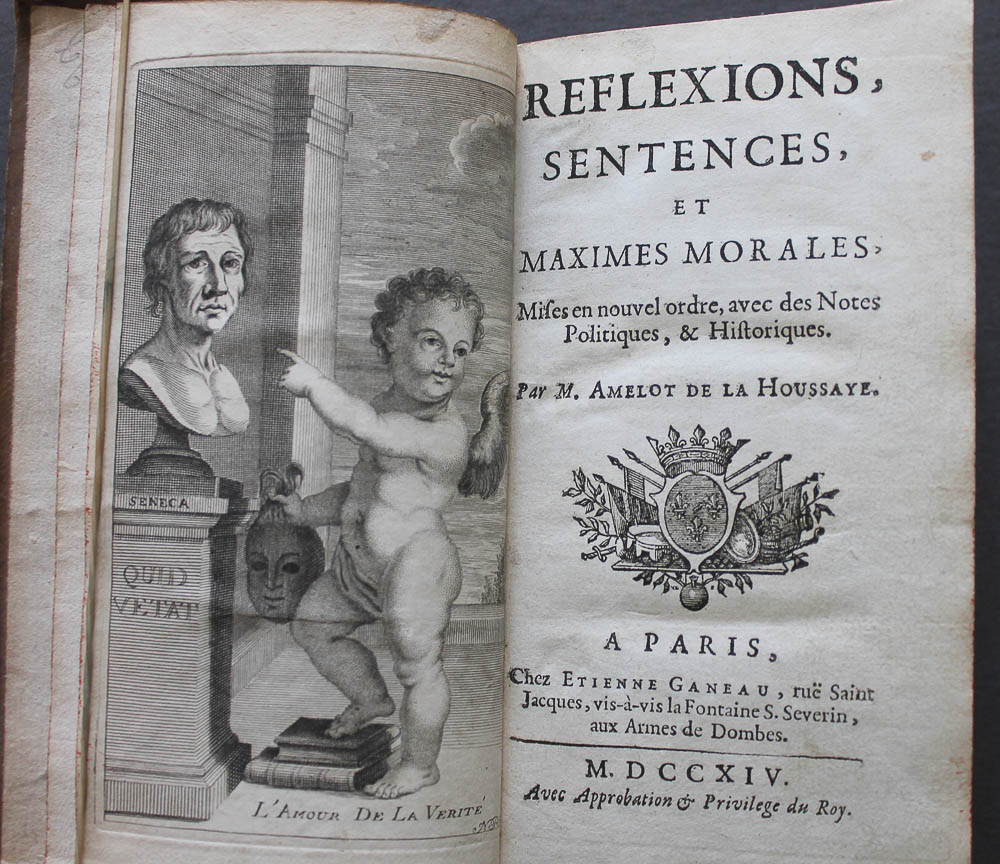 Paris: Chez Etienne Ganeau, ruë Saint Jacques, vis-à-vis la Fontaine S. Severin, aux Armes de Dombes, 1714. First edition. Engraved frontispiece, engraved headpieces. 8vo (6 3/4 x 4 inches), pages(24):253:(10), contemporary full dark tan calf, spine with raised bands and burgundy lettering piece. Rubbing at headband and head of upper joint. Overall a well bound clean & crisp copy. Printed label of Knoyle House, Salisbury on upper cover.