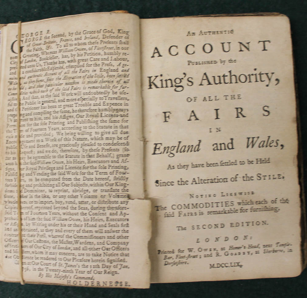 Preceding the title is the license leaf, on the recto of which is the printed note "N.B. All the Lists of Fairs are full of great Mistakes .... unless signed with the Hand Writing of Mr Owen", this above a facsimile of his signature. This leaf partially detached. Following the title Mr. Owen's address to the public. Rare.