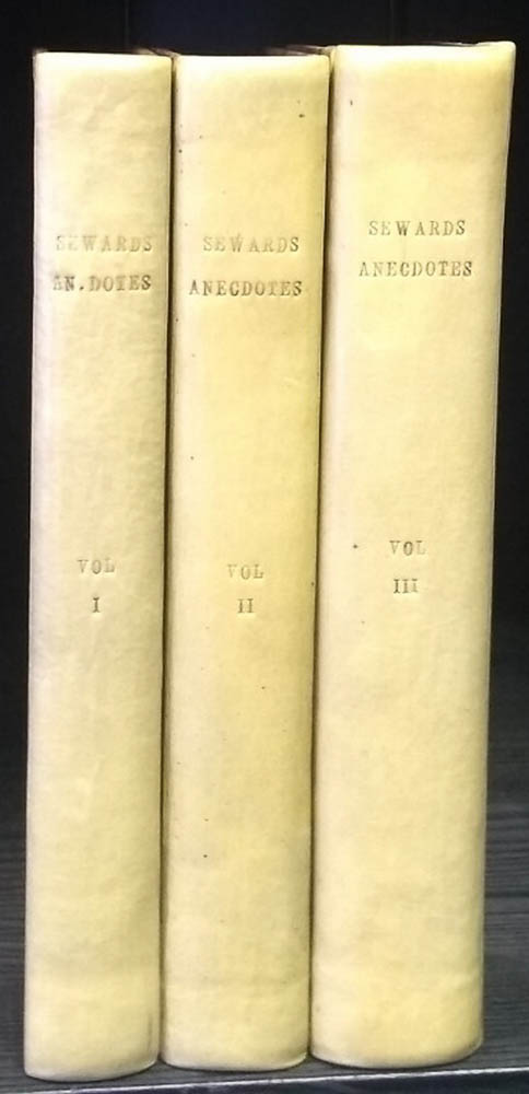 T. Cadell, London, 1795. Volumes 1,2, & 3. Engraved plates. 8vo (7 1/2 x 4 3/4 inches), pages: 280; 378:(1); 399 plus substantial unpaginated appendix & index, also 24-page additions and corrections to Volumes 1 & 2. Contemporary tan calf with a rather strange choice of vellum reback, lettered in blind. The upper cover of vol.3 replaced with stout card. Armorial bookplate. The front free endpapers of volumes 1 & 3 inscribed, "From Mr. Seward".