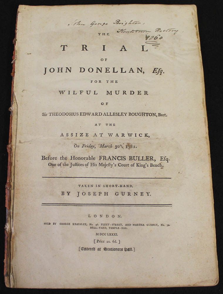 London : Sold by George Kearsley, No. 46, Fleet-Street, and Martha Gurney, No. 34 Bell-Yard, Temple-Bar, 1781. First edition. Folio (14 x 9 1/2 inches), 58-pages; disbound. Title page detached and dust-marked, first leaf torn without loss, tear to margin of last leaf. Later, 1860, inscription on title. Drawing of Mrs. Donellan's tomb and notes on her subsequent marriages below.