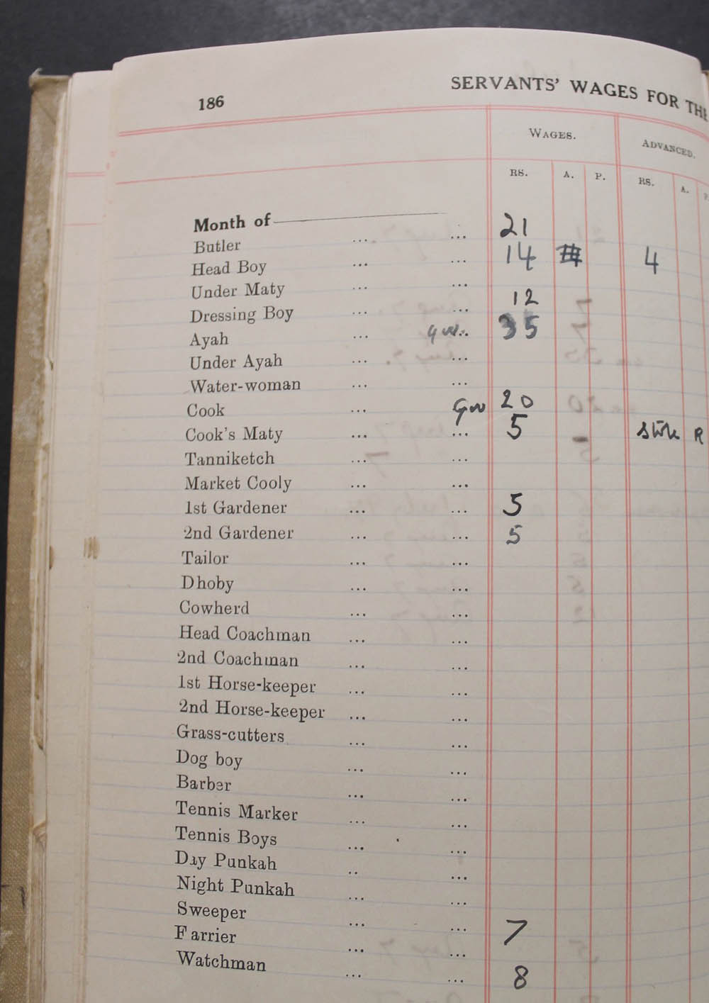 Another section is the "Baker, Milk, & Butter Account"; another is devoted to Servants wages for the period 1913-1914, showing the wages paid for the Butler, under Maty, Dressing Boy, Ayah, etc. other staff shown include,Cook's Maty, Dhoby, Cowherd, Dog Boy, Tennis Marker, Day & Night Punkahs, Sweeper, etc. (10-pages on manuscript entries), also pre-printed lists for items of laundry including Chemises, Combinations, Petticoats, Drawers etc. with some items added in manuscript e.g. Polo Breeches & White Mess Jackets. This section divided into 4 sections, i.e. Ladies, Gentlemen, Children, & Household Laundry.