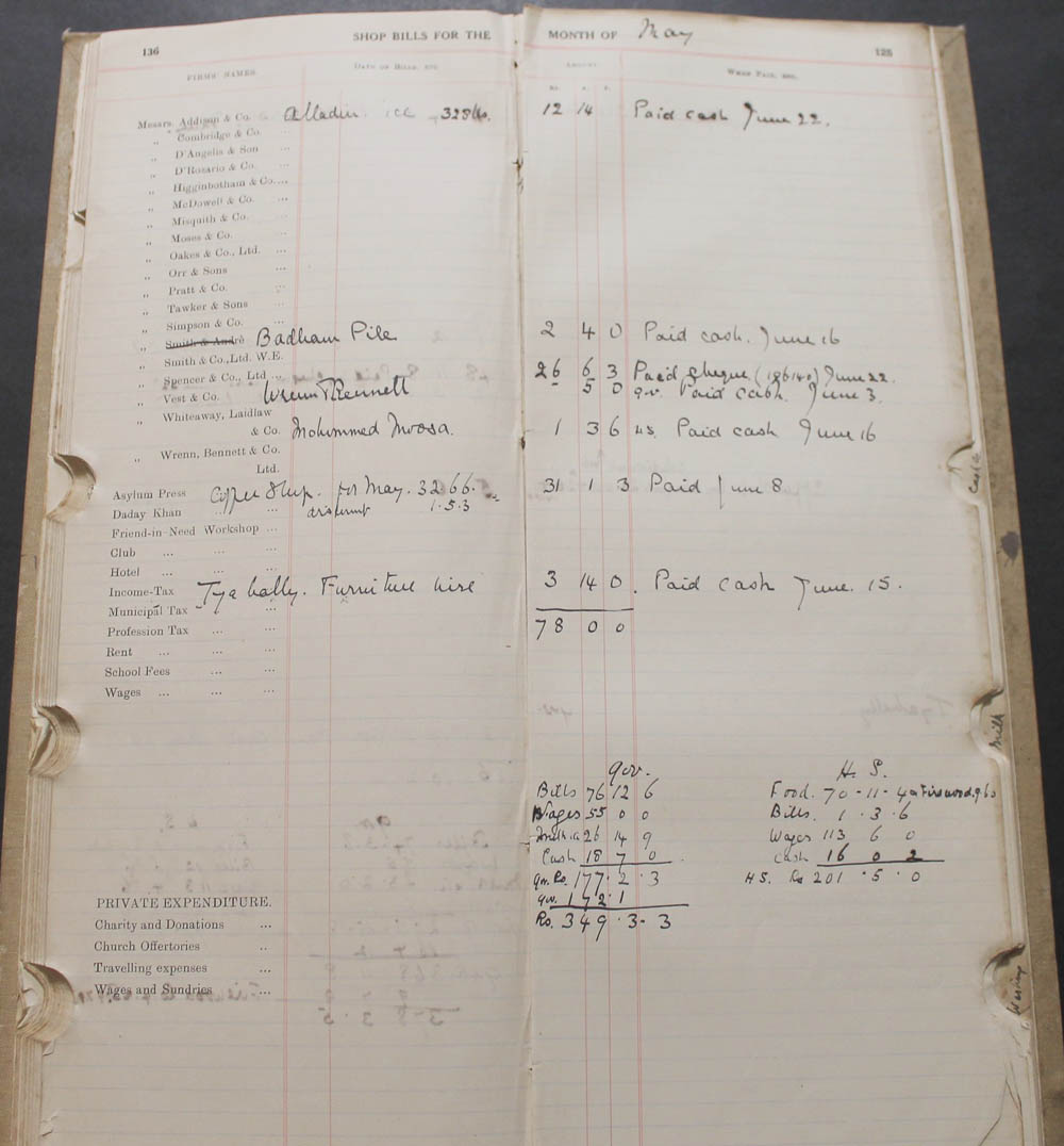 Another section is "Shop Bills" this pre-printed with the names of 18 establishments and other expenses, e.g. Club, Hotel, the Friend-in-Need Workshop etc.